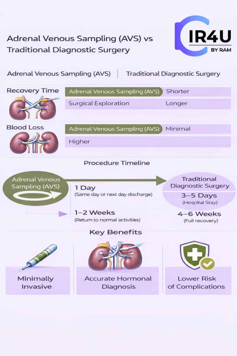 AVS provides highly accurate results, helps avoid unnecessary surgery, and ensures targeted treatment. It is considered the gold standard for diagnosing adrenal gland disorders like primary aldosteronism.