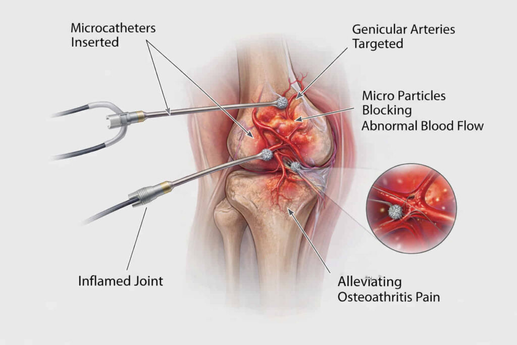 Genicular Artery Embolization (GAE) is a minimally invasive procedure that reduces knee pain by blocking abnormal blood flow to inflamed areas in patients with osteoarthritis.