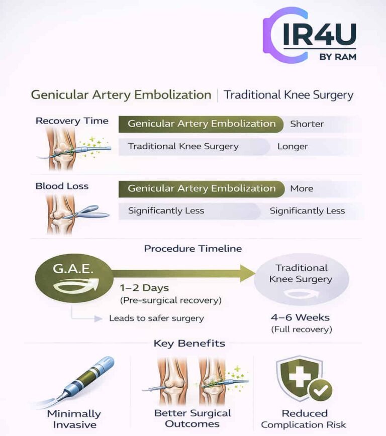 Unlike traditional knee surgery, GAE does not require opening the joint or replacing any part of the knee. It focuses on reducing inflammation by targeting blood flow to painful areas. Recovery is much faster, often within a few days compared to weeks or months. It also carries a lower risk of complications such as infection or blood loss.
