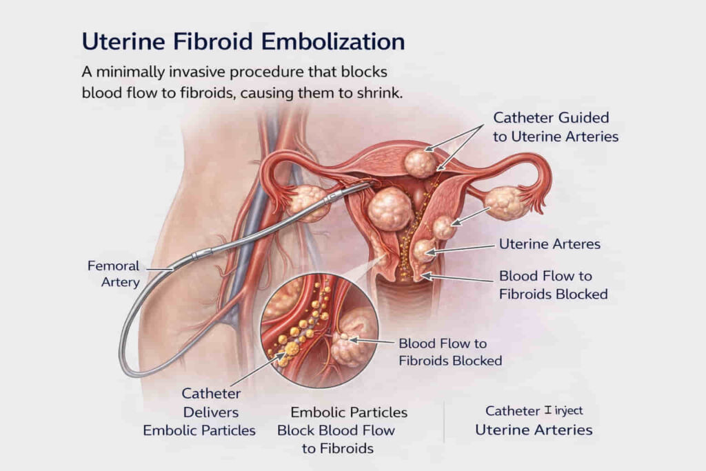 Uterine Fibroid Embolization (UFE) is a minimally invasive treatment designed to shrink Uterine Fibroids by blocking their blood supply while preserving the uterus. It is commonly recommended for women experiencing heavy bleeding, pelvic pain, or pressure due to fibroids, especially those who want to avoid major surgery.