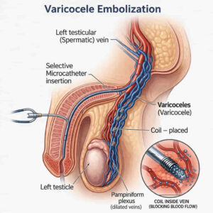 Varicocele embolization is an advanced, image-guided treatment designed to target faulty veins using tiny coils or embolic agents. This precise technique reduces vein enlargement, improves blood circulation, and helps relieve pain and infertility issues. Compared to traditional surgery, it offers faster recovery, minimal discomfort, and fewer complications.
