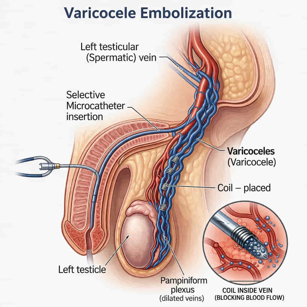 Varicocele embolization is a minimally invasive procedure that treats enlarged veins in the scrotum (varicocele) by blocking abnormal blood flow while preserving healthy veins and testicular function.